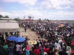 Crucifixions are also held in Barangay Kapitangan, Paombong, Bulacan[8] which is a locally-known pilgrimage area and haven for faith healers. Many women have been nailed to the cross, acting on directions "from above", claiming mediumship of Christ either as the Santo Niño or the Black Nazarene.[9]