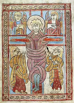 The format of a crucified Christ surrounded by angels above each arm and soldiers below draws on earlier figurations in 7th to 9th century Insular illuminated gospels, to the extent that it seems likely that the craftsmen had copies of these works.[13] Examples include f. 200r of the Book of Kells, f.38v from the Southampton Psalter, and miniatures from the Irish Gospels of St. Gall,[12] the Durham Gospels, and the spear-bearer on a long-side from the c. 1026 cumdach for the Stowe Missal.[20][21]