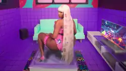 BlameItonKWay, who appears first in the video has a waist-length turquoise wig with top knots and a crown of braids.[26] Megan sports various toy-inspired looks, including a yellow racetrack jumpsuit, a pink Barbie doll bikini with blue flowers, and a floral hula girl outfit.[15] In between scenes, she also has a bouquet-like headpiece on top of her hair, a pastel pink waist-length hairdo, and black pigtails with a zig-zag middle part. The dancers wear heavy eyelashes, electric blue eyeshadow, winged liner, and subtle rhinestones to match Megan's bedazzled floral nails.[26] The 50-inch long platinum, pastel-coloured floral look two hours to hand-paint with a stencil. The hairstylist was aiming for a "Malibu Barbie"-look.[40]