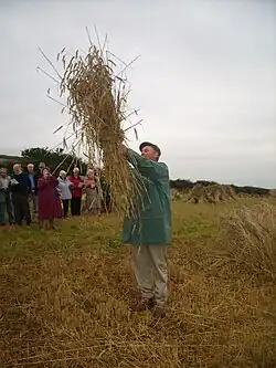 The tradition declined following the invention of machines such as the combine harvester, but despite this has persisted into modern times across Devon and Cornwall[1] albeit to a more limited extent. In Devon the tradition was still recorded as occurring regularly on the Exmoor coast in 1950,[2] and more recently has seen reintroduction elsewhere such as Stoke where it occurs annually alongside the Village Summer Fair. In Cornwall there was an organised revival of the practice on five farms in the 20 years after the Second World War by the Old Cornwall Society,[2] which still organises most events where the tradition is practised to this day.