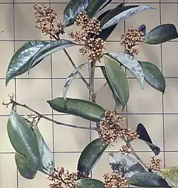 Cryptocarya densiflora, commonly known as cinnamon laurel or white laurel,[2] is a tree in the laurel family and is native to north Queensland and parts of Indonesia. Its leaves are lance-shaped to elliptic, the flowers yellowish-green and brown, tube-shaped but not perfumed, and the fruit is a flattened spherical, reddish maroon drupe that turns black when ripe.