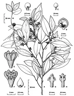 Cryptocarya smaragdina, commonly known as Dina's laurel,[2] is a species of flowering plant in the family Lauraceae and is endemic to north Queensland. It is a shrub with lance-shaped leaves, creamy green, unpleasantly perfumed flowers, and spherical black drupes.