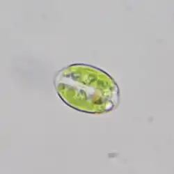 Cryptoglena (/ˌkɹɪptoʊˈgliːnə/) is a genus of photosynthetic euglenids that was first described in 1831 by Christian Gottfried Ehrenberg.[2] Today, its circumscription is controversial: Bicudo and Menezes[3] consider twenty-one species as Cryptoglena, of which, nine are uncertain. Cryptoglena species are water-based, living in both freshwater and marine environments. They are biflagellated, with one internal flagellum and one external flagellum, which allows movement through environments as demonstrated by Kim and Shin[4] in the species C. pigra. The cells of Cryptoglena resemble a coffee bean, as they have a groove that runs the length of the cell on one side and makes them U-shaped in cross section. They are ovoid in shape and are small, with the larger cells being on average 25 x 15 μm.[5] After being first described in 1831, little work was done on the genus until the late 1970s and early 1980s, after the scanning electron microscope completed development and was implemented into laboratories.[6] Work then proceeded with the developments of molecular biology, which allows for classifications based on DNA sequences. For Cryptoglena the main DNA used for classification are small subunit (SSU) and large subunit (LSU) rDNA.[5]