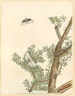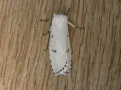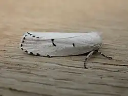 The wingspan is about 25 mm for males and about 40 mm for females. The wings are silvery-white, the anterior pair with three small black spots in the middle and a marginal row at the extremity; hinder wings black in the male, white in the female, with a series of angular black marks at the hinder margin: abdomen with a square spot of bright red toward the base.[2]