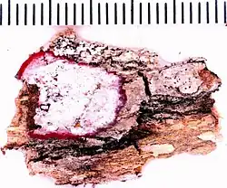 Cryptothecia rubrocincta is a crustose lichen, because it grows in the form of a surface crust. The thallus, or body of the lichen is spread out flat and can be either tightly to loosely attached to the growing surface. It is 0.15–0.30 mm thick, and can be smooth, or have low radiating ridges. The older, central region of the lichen surface has many reproductive structures called isidia; they resemble granules that are 0.1–0.4 by 0.1 mm. The species relies entirely on vegetative means to reproduce, and is not known to have any sexual structures.[15] From the center outwards, three color zones can be differentiated in mature specimens; the first grayish-green, the second white, and finally a bright red cottony rim.[18]