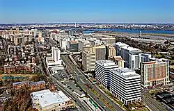 ![]() Aerial view of Crystal City (foreground) and the Potomac River and Washington, D.C. (background) in September 2020 | |