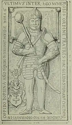 The tombs of Stephen (II) and Francis (III) were buried in the crypt under the sanctuary in the church of Csetnek. In late 19th century, these were transferred to the south chapel. Stephen's 2.2-meter-long and 1.32-meter-wide tombstone is made of coarse-grained sandstone. According to its epitaph, Stephen, last of his brothers, died in Dobsina on 15 June 1594 at 6 pm. Another epitaph in the western part of the tombstone writes that "Stephen did not believe before [the siege of] Fülek that he would rest in peace in the earth. But suddenly a terrible pain filled him. The Judge quickly raised his bloody hand to him". Based on this, Slovak historian Monika Tihányiová considered that Stephen was killed in action during the first year of the Long Turkish War. The tombstone relief depicts the full-figured Stephen with mustachioed face in knight's helmet and chest armor but his legs are uncovered. His head rests on a pillow. The figure holds a mace in his right hand, his left hand rests on the hilt of a sword attached to his waist belt. Stephen's sarcophagus may have been made in a local stone carving workshop, perhaps commissioned by his sister Sophia and her son Stephen Görgey.[93]
