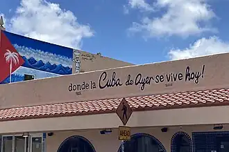 The reconstruction of outlawed businesses and social organizations in Cuba by exiles now in Miami, reaffirmed the memories of the idyllic Cuba de ayer.[29] This reconstruction came from the waning of a hope to return to a Cuba without Fidel Castro in power, so Cuban exiles began to model their communities in the image of the Cuba de ayer. The most notable of these communities is Miami's Little Havana neighborhood.[31] Little Havana became an epicenter for Cuban life in Miami, specifically in how many institutions are Cuban owned and modeled in the image of nostalgia for the Cuba de ayer.[32]