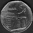 $0.05 18 mm 2.65 g Compact disc with a steel core and a shiny nickel coating. Reeded Colonial House, its face value of 5¢ in numbers, and the vignette "CASA COLONIAL". The Cuban coat of arms, the legend "REPUBLICA DE CUBA", its face value in letters "five cents," and the year of issuance. 1994, 1996, 1998, 1999, 2000, 2002, 2006, 2008, 2009, 2013, 2016, 2017, 2018