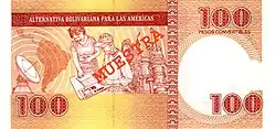 $100 150 x 70 mm Red, orange, and bright yellow Monument to Carlos Manuel de Céspedes. ALTERNATIVA BOLIVARIANA PARA LAS AMERICAS (ALBA): Satellite dish, Latin America map, woman and man reading, oil refinery. 2006, 2007 January 1, 2021 Visible against the light José Martí's effigy and number "100".