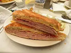 A Cuban sandwich (Spanish: Sándwich cubano) is a variation of a ham and cheese sandwich that likely originated before the turn of the 20th century in cafes catering to Cuban workers in Tampa[1][2] or Key West,[3] two early Cuban immigrant communities in Florida centered on the cigar industry. Later on, Cuban exiles and expatriates brought it to Miami,[2] where it is also very popular. The sandwich is made with ham, mojo, roasted pork, Swiss cheese, pickles, mustard, and sometimes salami on Cuban bread.[1][4][5][6][7] Salami is included in Tampa, but is not usually included in South Florida.[8][9][10]