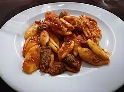 Basilicata is considered the region with the highest consumption of pasta. The figures reach 42 kg (93 lb) per capita per year, compared to the national average of 24 kg (53 lb).[20] Typical pasta formats of the region are strascinati, cavatelli (also known as rascatielli), ferretti (also known as ferricelli, fusilli or frizzuli), orecchiette, maccaronara, lagane (not to be confused with lagane, better known as "lasagne"), an ancient pasta format dating back to Roman times, similar to tagliatelle but slightly shorter and thicker, and manate, a long pasta rather thick and irregularly shaped.[21]