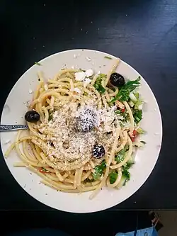 Magarına bulli is a traditional Cypriot meal made of bucatini pasta and chicken. This dish is widely known as one of the national dishes of Cyprus. Chicken is often boiled in water which is then used as the stock to cook the pasta. When the pasta and chicken are cooked, the pasta is often topped with lemon juice, grated halloumi cheese and dried mint.