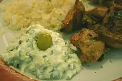 Mezedes is a large selection of dishes with small helpings of varied foods, brought to the table as a progression of tastes and textures. The meal begins with black and green olives, tahini, skordalia (potato and garlic dip), humus, taramosalata (fish roe dip), and tzatziki / cacık (ttalattouri in Cypriot), all served with chunks of fresh bread and a bowl of mixed salad. Some of the more unusual meze dishes include octopus in red wine, snails in tomato sauce, brains with pickled capers, samarella (salted dried meat), quails, pickled quail eggs, tongue, kappari pickles (capers), and moungra (pickled cauliflower). Bunches of greens, some raw, some dressed with lemon juice and salt, are a basic feature of the meze table. The meal continues with fish, grilled halloumi cheese, lountza (smoked pork tenderloin), keftedes (minced meatballs), sheftalia (pork rissoles), and loukaniko (pork sausages). Hot grilled meats – kebabs, lamb chops, chicken – may be served toward the end. The dessert is usually fresh fruit or glyka – traditional sugar-preserved fruits and nuts.[1]