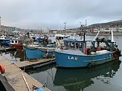 Swansea still has a considerable fishing fleet of small boats, and these have replaced the city's original deep-water fishery. The vessels go out on short, one-day, voyages and return with fresh fish, which are sold on the fish slabs of Swansea Market and at the Swansea fish docks.[3] Mackerel is a summer and autumn visitor and is eaten fresh. It can be smoked, marinaded or made into a pâté.[3] It can be caught around the coast of Gower and, in August, shoals of harvest mackerel can be found chaffing the sea in pursuit of their own fry.[3] Sea bass is said by Pressdee to be one of Gower's most beautiful sea fish; it thrives in rough weather and can be caught in the rock gullies of the Gower headlands as it searches for crabs.[3] Fishing trawlers often land big quantities of squid and cuttlefish in the summer, and this can be inexpensive. They can be eaten with charred vegetables grilled on the traditional flat bakestone, or stuffed.[3]