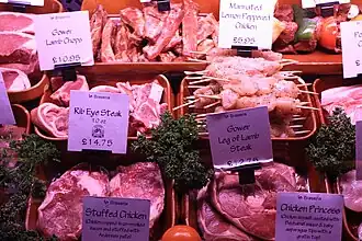 Meat and game can be bought at a number of local butchers' shops. Paul Tucker and Son trade at Penclawdd, selling locally sourced beef, lamb (including Llanrhidian salt marsh lamb), poultry, and pork, and their own bacon, faggots, and award-winning beef and lamb burgers. Howells is another Penclawdd butcher, and supplies salt marsh lamb from the marshes at Llanrhidian.[4] Weobly Castle Farm sells Gower salt-marsh lamb.[5] In Swansea, Gower butcher Hugh Philips and his family have had a stall at Swansea Market since 1878, when his grandfather started the business. Meat is sourced from the family farm in Gower and neighbouring farms. They specialise in Welsh lamb, seasonal salt-marsh lamb, and traditional beef breeds, such as the Welsh Black. They also make home-made sausages.[10]
