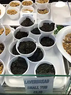 Laverbread (Welsh: bara lawr) is made from the seaweed porphyra umbilicalis.[11] The seaweed is purplish-black and found strewn throughout the intertidal area of Gower, particularly the upper levels. It is more common in the winter period, from late autumn onwards, where the rocks are near, or overlain with, sand. This seaweed can be found on most of the rocky beaches of Gower; it appears to be in greater volume, probably because it is less frequently collected for laverbread than before.[11] Traditionally, it is boiled for hours to render it into a thick puree. It is sold in Swansea Market but, if gathered fresh, it can be deep-fried into tasty crisps.[3] Other recipes include laverbread breakfast cake, laverbread and cockle pâté, laverbread with streaky bacon, and laverbread with mashed potato.[12] There are still some small producers of Gower laverbread, but larger quantities are sourced from the west coast of Scotland.[13] A Gower breakfast can comprise griddled bacon with cockles, laverbread and baked eggs.[14]