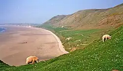 Gower is well known for the quality of its lamb. On the sandstone areas, such as Cefn Bryn, Davies comments: "The sheep feeding thereon are noted for fineness of wool and well-flavoured mutton."[2] Of particular note is the quality of the lamb grazing on the salt marshes of the Burry Inlet. The animals spend their life grazing on a diet of salt marsh grasses, samphire, sea lavender, sorrel and thrift, which gives the meat a fine flavour.[5] Gower salt marsh lamb was awarded registered as a Protected Designation of Origin under UK law in 2021.[6] and (despite opposition of France) under EU law in 2023.[7]