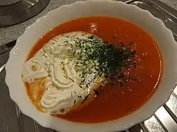 One of the most popular soups in Hamburg, is the creamy lobster soup called Hamburger Hummersuppe which is served with a small amount of whipped cream and garnished with dill. A variation of this soup is the small shrimp soup Hamburg style, called Hamburger Krabbensuppe. Adding a dash of Cognac to both variations is optional but very common. The Hamburg variation on the Steckrübeneintopf which is popular all over North Germany is called 'Hamburger National'. Birnen, Bohnen und Speck, Labskaus, and the Hamburger Aalsuppe are further examples for the stews of Hamburg of which the latter is a vegetable stew with root, green vegetables and dried fruit which rose to supraregional popularity due to the controversy if it has to be served with or without eel. However, the preparation without eel is considered folk-etymological.
