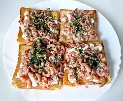 As in any larger city, there is a great variety of snacks available in Hamburg. Apart from international products like Doner Kebab, Asian cuisine, or pizza, there are some snacks with a local or regional tradition. Next to the popular fish sandwiches which are called Fischbrötchen, toasted white bread with small, brown shrimps from the North Sea called Krabbentoast is popular either for breakfast or as a snack at lunch time. Other popular snacks are Currywurst which comes in different styles made with different kind of sausages, or Knackwurst.