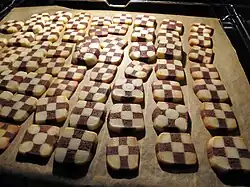 The original bread roll of Hamburg is called "Rundstück" (lit.: round piece) and those that were not eaten for breakfast are plated with slices of roasted pork, smothered in sauce and are then called "Rundstück warm" for lunch (lit.: round piece warm). A famous bread is Schwarzbrot, a dark and fluffy whole wheat bread. For tea (or 'coffee and cake' as teatime is called in Germany) Kopenhagener are served which is filled with jam or marzipan. Another famous baked good for 'coffee and cake' is the traditional apple pie of Hamburg which is prepared by pan frying the apples and deglazing them with white wine before baking the actual cake. "Black and white cookies", either self-made or bought in local pastry shops, are popular in Hamburg, too. Franzbrötchen are also very popular: Despite the name contains the word Brötchen, it is not a roll but a kind of flaky pastry typical only for Hamburg and baked with much butter and cinnamon. Locals enjoy it for breakfast, too. In Christmas times, there's Klöben (also called 'Stollen' in other parts of Germany), a bread-shaped pastry made of yeast dough with raisins and succade. 'Braune Kuchen' (lit.: brown cakes) are crisp rectangular biscuits baked with molasses and gingerbread spice that are based on a recipe developed back in 1782 from the Konditorei Kemm.[6] 'Weiße Kuchen' (lit.: white cakes) however are a kind of fried dough foods. The so-called Heißwecken (lit.: hot rolls) are a yeast dough product with raisins that are dusted with confectioner's sugar and filled with cream and are traditionally eating during lent.