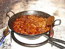 - Cocido madrileño: A popular beef and vegetable stew that is frequently offered as a Tuesday special. Consisting of chickpeas (Cicer arietinum), meat (usually beef), vegetables, and sausage, the dish is served in three courses. The first course consists of a broth-based soup, the second includes beans and vegetables, and the final course contains meat and sausage.