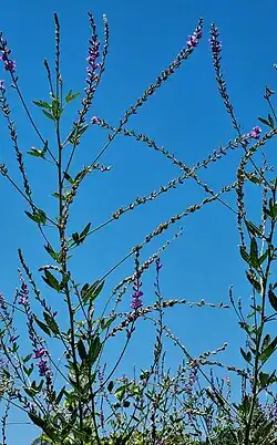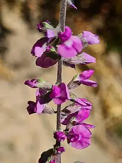 Cullen australasicum can grow to a height of 2.5 metres and a width up to 1.5 m.[1] Stems can become woody at the base.[1] The toothed rough leaves are trifoliate, with leaflets mostly 1-5cm long and 1-3cm wide.[1] The small lilac pea-flowers are in groups of three, and held on long spikes well above the leaves.[2] The seeds are light brown and egg-shaped.[1]