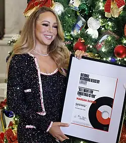 The album's lead single, "All I Want for Christmas Is You", became the first holiday song to be certified Diamond by the RIAA,[137] and the only holiday ringtone to reach multi-platinum status in the US.[138] With sales of over 14 million copies worldwide, it is one of the best-selling physical singles in music history and the best-selling holiday song by a female artist.[139] It is also the highest-certified and the longest-charting song by a woman in the UK.[140] On November 24, 2019, the song won three Guinness World Records.[141] In 2023, the song was selected by the Library of Congress for preservation in the National Recording Registry, due to its "cultural, historical and aesthetic importance" in the American soundscape.[142]
