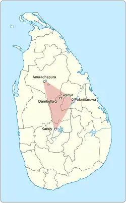 Sri Lanka's Cultural triangle is situated in the centre of the island and covers an area which includes the World Heritage cultural sites of the Sacred City of Anuradhapura, the Ancient City of Polonnaruwa, the Ancient City of Sigiriya, the Ancient City of Dambulla and the Sacred City of Kandy. Due to the constructions and associated historical events, some of which are millennia old, these sites are of high universal value; they are visited by many pilgrims, both laymen and the clergy (prominently Buddhist), as well as by local and foreign tourists.[1]