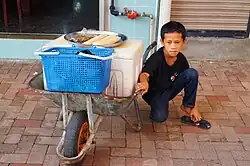 Tausug men wear the sawwal kuput or sawwal kantiyu (tight and loose trousers respectively), and match this with the badju lapi, a collarless short-tailored jacket similar to the biyatawi. The sleeves of the badju lapi are either long or "three-fourth's" with slits at the wrists. The badju lapi is likewise ornamented with tambuku on the breast, shoulders, and cuffs. The legs of the sawwal kaput are skin-tight down to the ankles, and have 22.5 cm slits on each side, which are also decorated with buttons. A kandit (handwoven or embroidered sash) tied around the waist serves to keep the sawwal kuput in place. A pis siabit is either tied around the head or left to hang on the shoulder (Amilbangsa 1983:114–130).