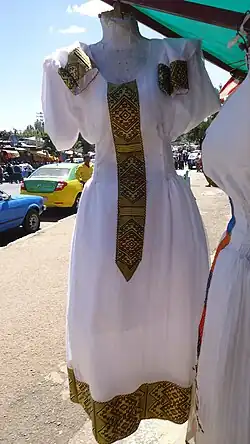 Men wear pants and a knee-length shirt with a white collar, and perhaps a sweater. They also frequently wear knee-high socks, while women might not wear socks at all. Men as well as women wear shawls, the netela. The shawls are worn in a different style for different occasions. When going to church, women cover their hair with them and pull the upper ends of the shawl about their shoulders reproducing a cross (meskelya), with the shiny threads appearing at the edge. During funerals, the shawl is worn so the shiny threads appear at the bottom (madegdeg). Women's dresses are called habesha kemis, and are often made from the shemma cloth. The dresses are usually white with some color above the lower hem. Bracelets and necklaces of silver or gold are worn on arms and feet to complete the look. A variety of designer dinner dresses combining traditional fabric with modern style are now worn by some ladies in the cities.