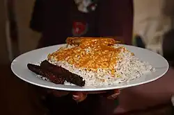 Goan curries use a lot of coconut, coconut oil and curry leaves while chili peppers, spices and vinegar are also used. Fish curry and rice (Xit kodi in Konkani) forms the staple food of the community. Goan Catholic cuisine has distinct Portuguese influence as can be seen in Sorpotel, a pork dish often served with Sannas (steamed rice cakes) as the main dish at wedding dinners and Christmas dinner, while Pão com Chouriço (bread with Goan pork sausage), Chouriço Pulão (Goan pork sausage pilaf), Vindalho, Aad Maas (pork ribs), Assado de Leitão or Assado de Porco (roasted pork) and Carne Assada (roasted beef) are also popular. Goan Catholics mix pork blood and other organs in most of their pork delicacies as can be seen from Cabidela. Xacuti (pronounced [shakuti]) is dish originally from Goa prepared with either mutton, beef, pork or chicken.[2] Canja de galinha and Frango à cafreal (Chicken cafreal) are well-known chicken dishes. Beef croquettes, beef potato chops and prawn rissoles are common snacks. Roast beef and beef tongue are popular entrees at Goan celebrations.