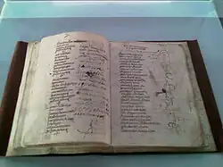 Literature in the Basque Country may refer to the literature made in Basque, Spanish, and French. Basque, historically the primary language of the territory at either side of current French-Spanish border, was not prone to be written until the early Modern Period, aside some short poems (Beotibarko gudua), letters (between Navarrese high-ranking officials in the early 15th century), loose phrases, and notations. Stories and poems were transmitted down generations by oral tradition.[3] The official Spanish and French languages were preferred (often compulsory) for written works starting in the 16th century. However, the coming of the printer allowed for the first glossy Basque literary sprouts to spring up (Bernard Etxepare with Linguae vasconum primitiae, 1545; Joanes Leizarraga) in the mid-16th century.[3]