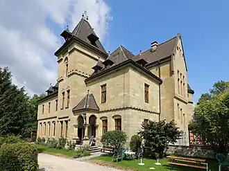 In 1882, George V's son, Ernest Augustus (1845–1923), Crown Prince of Hanover, and 3rd Duke of Cumberland and Teviotdale, decided to build his own castle.[1] He acquired land near the Queen's Villa on a hill north of the centre of Gmunden above the Krottensee. He commissioned the Hanoverian architect Ferdinand Schorbach to design a castle in gothic revival style.[2]