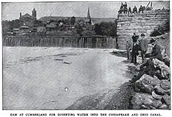 The Cumberland Dam was a dam that was built across North Branch of the Potomac River in Cumberland, Maryland, for the purpose of diverting water from the river into the head of the Chesapeake and Ohio Canal. The Chesapeake and Ohio Canal Company began construction of Dam No. 8 in 1837 and work proceeded intermittently, finally concluding in 1850.[1]: 242 The dam impounded water over a distance of a mile, causing back water for about 3 miles (4.8 km) up the river. Above the dam is the mouth of Wills Creek.