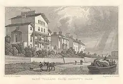 The Regent's Canal was developed as a means of delivering goods into the North of London. It linked the Grand Junction Canal's Paddington Arm with the River Thames at Limehouse.[4] The Cumberland Arm was built as a spur off it and led between Nash's Park Village West and Park Village East to the Cumberland Basin which was lined by a collection of wharfs and warehouses. Hay and straw were brought in for sale at the Market and for the nearby Albany Street cavalry barracks.[5] Barges, each capable of carrying thirty tons, would also arrive with heavy goods such as stone and lime for building; coal and timber for the neighbouring coach-building and furniture trade. Ice, too, was brought in for the ice-merchant, William Leftwich, who had an icehouse that was eighty-two feet deep and with a capacity of 1,500 tons under the Market.[6] Vegetables and cattle were carried in as well, thus reducing the need for the latter to be driven into the city.