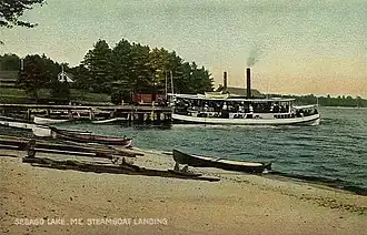The flat-bottomed canal boats had blunt bows, square sterns, and a loaded draft of 3 feet (0.91 m). A tow path adjacent to the excavated portions of the canal enabled horses to tow the canal boats while the boatmen steered, or the boats could be moved by poles when the need arose; usually while passing through the Songo lock. Canal boats using the lakes had a hinged centerboard keel and two hinged masts capable of supporting gaff rigged sails which would be folded down for passage under bridges through the excavated canal. Cargos included lumber, masts, barrel hoops and staves, boxmaking shook, and firewood from the interior to Portland. Apples were an important agricultural product of the area; and Oriental Powder Company mills adjacent to the canal in Windham manufactured nearly 25% of the Union gunpowder supply for the American Civil War.[5] Canal boat passengers were charged one-half cent per mile. A wide variety of manufactured goods moved inland through the canal from Portland. The south end of Long Lake is locally known as Brandy Pond because a barrel of brandy was lost from a canal boat during passage through that part of the waterway.[6]