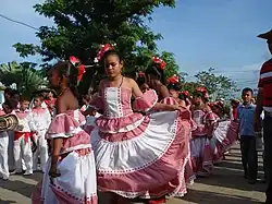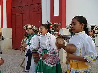 The cumbia is the most representative dance of the coastal region in Colombia, and is danced in pairs with the couple not touching one another as they display the amorous conquest of a woman by a man.[4] The couple performing cumbia dances in a circle around a group of musicians, and it involves the woman holding lit candle(s) in her right hand that she uses to push the man away while she holds her skirt in her left.[5][4] During the dance, the partners do not touch each other, and the man dances while holding a sombrero vueltiao that he tries to put on the woman's head as a representation of amorous conquest.[5] This dance is originally made to depict the battle that the “black man had to fight to conquer an indigenous woman”. The story continues and the dance shows that this leads to a new generation and is depicting the history of the coast of Colombia.[6]