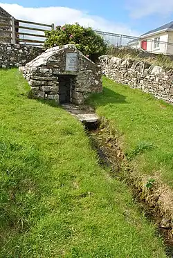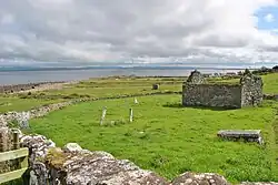 Curative powers were also ascribed to earth coming from the saint's grave. The prerogative of administering it to visitors belonged to the Machan (Maughan) or Loughney family, presumably because the family was known to descend from the erenachs (wardens) of the church.[1] A flagstone at the saint's grave known as Leac Cuimín (The stone of Cuimín) is thought to have been used as a 'cursing stone' under similar guidance: members of the Machan (Maughan) or Loughney [6] family could be asked to perform a ceremony to call down maledictions on people who had caused harm to others.[1][7] The practice came to an end in the first half of the 19th century, when a dean by the name of Lyon had it removed "for certain weighty reasons" and built into the wall of the cathedral at Ballina, County Mayo.[7] Others say that the stone was built into the wall of St Patrick's Cathedral, Killala.[8]