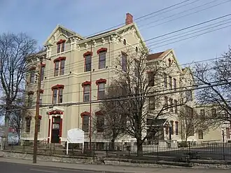 One of several Cincinnati school buildings designed by Samuel Hannaford, the Cummins School is a 3+1⁄2-story building.[3] Built of brick with a stone foundation, it is topped with an asphalt roof and includes other elements of stone.[4] Among its distinctive features are wrought iron stairways, ornamental wooden frames around the doors and windows, and wainscoting. The building's general floor plan features a central hallway, with classrooms lining both sides.[3] The building as a whole was laid out in the shape of a double letter "E" to allow each room an increased amount of window space. Besides classrooms, the interior was equipped with rooms such as a library, a laboratory, and an office for the principal. One of the many forward-looking elements of its design was the heating system: although the building was originally heated with stoves, it was built to permit easy conversion to a steam-powered central heating system.[5] More than thirty years after the building's construction, it was expanded by the addition of a small Neoclassical structure on its rear.[3] The building as a whole was built in the Italianate style,[1] similar to other Cincinnati schools built at the same time, such as the McKinley School on the city's east side.[5]