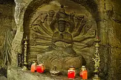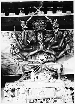 Cundī remains especially popular in China, where Cundī practices were promoted by some modern Chinese Buddhist figures, like Nan Huai-Chin.[25] In Chinese Buddhist temples in Southeast Asia, statues of Cundī are traditionally enshrined in vegetarian halls (齋堂; zhaitang).[26] In modern Chinese Buddhism, she is also sometimes identified with Marīci or the Queen of Heaven.[20] Her mantra is used by contemporary Chinese healers[27] and is also a central practice in numerous Chinese Buddhist rituals such as the Yujia Yankou rite.[28]