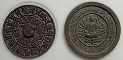 It is a defining feature of Zhunti practice, beginning with the Tang translation of the Cundī Dhāraṇī scriptures, that devotees are encouraged to use a mirror – "as an altar" (wei tan), some of the texts say – to facilitate visualization. Gazing into a mirror while reciting the dhāraṇī, one is to visualize both the image of the deity and the mystic letters that embody her. In time, the small disc-shaped bronze mirrors used for this purpose came to be commonly imprinted, on the back, with the deity's iconic form, according to the canonical description, and, on the front and/or the back, with the inscribed dhāraṇī. It was not unusual to have the Sanskrit version of the spell embossed on the outer edge of the front or reflecting side of the disc, and to have the transliterated Chinese version embossed on the circumference of the back. The effect is of an image of the goddess encircled by "garlands" of sacred syllables, as though to reinforce the claim that the goddess and the incantation were inseparable, perhaps even mutually constitutive. And, of course, as the instrument in question is a mirror, the fusion of goddess and spell is further fused with the practitioner's own reflection. Sometimes, to emphasize the theme of communion between devotee and deity, the goddess's image is imprinted on the back of the mirror, facing backwards, so that someone viewing the rear of the mirror would see the back of the goddess and could therefore easily imagine, when gazing at his or her own image in the front of the mirror, that it was the goddess herself, in the guise of one's own visage, who is gazing back.[2]