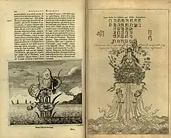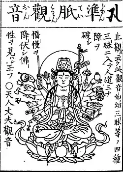 Cundī Esotericism was also widely practiced by Chinese Buddhist laypersons during the Ming. In P'eng Chi-ch'ing's (1740–1796) biography of lay Buddhists, the most popular mantras among laypersons were the Cundī mantra and the Great Compassion Mantra.[24] She is also prominent in the art of the late Ming, such as in the paintings of Chen Hongshou (1598–1652).[21] The popularity of Cundī Esotericism among the laypeople in the late Ming is also attested by German Jesuit Athanasius Kircher (1602–1680) who included an illustration of the deity in his famous China Illustrata (1667).[23]