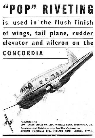 The Concordia was 12-seat medium range transport aircraft. A separate luggage compartment could accommodate 45 lbs of luggage per passenger. Designed by W. Garrow-Fisher and built at Eastleigh, Hampshire in 1947. The prototype aircraft Y-0222 was first flown at Eastleigh on 19 May 1947. A second aircraft G-AKBE was displayed at the 1947 SBAC Show at Radlett and made an extensive European sales tour.