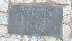 The memorial cairn to Patrick Leslie was erected by the Rosenthal Shire Council and unveiled on 10 December 1959 by the Shire Chairman, J. A. Costello.[11]