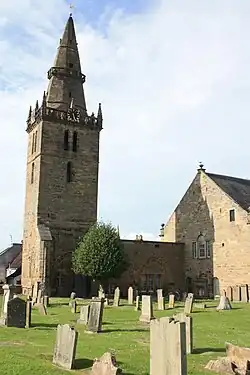 On the Bonnygate, the Category A-listed[26] Preston Lodge built by the Laird of Airdrie is the town's second oldest building.[7][27] The house was built in 1623 and is inscribed on a stone on the west wall. The house was extended in 1702 by James Preston and was remodeled by London goldsmith William Preston, in 1765. Later, the Reverend Sir James Preston occupied the house between 1775 and 1791, when he was the minister of the Cupar Old Parish Church.[27] The original design of the building is believed to have been inspired by Culross Palace in Culross.[7] Situated at the corner of the Crossgate, the Category C[28] listed Duncan's Institute by John Milne, which was built 1870–71[29] as a mechanics' institute for the "working classes of Cupar" by Mrs Duncan. The building, a mixture of Gothic, Scottish and Flemish styles is recognised in the town for its twisted spire. On the Kirkgate is the Parish Church of Cupar Old and St Michael of Tarvit, designed by the architect, Hay Bell.[7] This consists of the Category A-listed[30] Parish Church tower dating from 1415 and the Category B-listed main church building from 1745.[7] The tower is the only surviving piece of the old Cupar parish church, founded by the priory of St Andrews.[7][31]