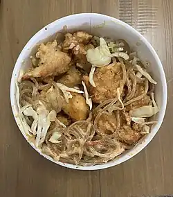 Cupbop's menu consists primarily of steamed rice bowls. They offer several different types of bowls, including chicken, beef, pork, vegetables and tofu, all served Korean barbecue style alongside rice and cabbage.[26][5] Cupbop also serves other Korean staple foods such as mandoo (a Korean dumpling) and kimchi.[27][28]