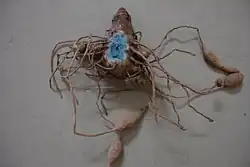 The cultivation and harvest practices are similar to that of common turmeric.[3] In the fields, the rhizomes are washed thoroughly and are placed in a wide mouthed cauldron. The water is poured in the cauldron such that the rhizomes are completely covered. The cauldron is covered with a lid, and the rhizomes are boiled for about 30 minutes until foam oozes out with a strong odour. The rhizomes are taken out when the water is reduced to one-third of the original and they are soft and their inner portion has turned from blue to dark or pale brown. The rhizomes are then dried in hot sun for 10 to 15 days until hardened. These dried rhizomes are then packed for marketing.