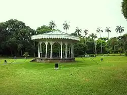 The gardens are intersected by a river and a lake – set about with Nandia palms. There is also a gazebo, at which community events are sometimes hosted. This Victorian-style kiosk has a raised wooden board floor, designed specifically for acoustics to cater for the audiences which attended the early concerts.