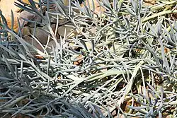 A succulent, spreading shrub, it reaches over 1 meter in height. The brittle, succulent branches lose their leaves lower down. The leaves are blue-green to blue grey, pruinose, succulent, erect, tapering and flattened laterally, with translucent lines down both sides. The flower capitula have no ray florets, and appear on a terminal, branching inflorescence.